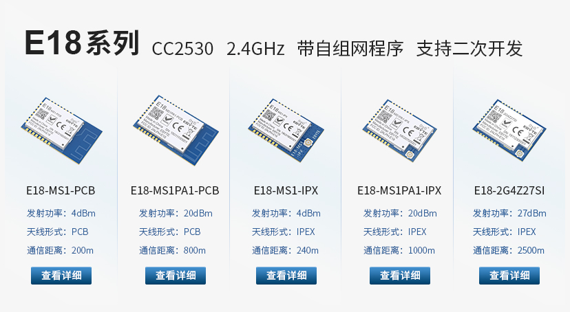 E18-2G4Z27SI、E18-2G4Z27SP、E18-MS1-PCB、E18-MS1-IPX、E18-MS1PA2-PCB、E18-MS1PA2-IPX等zigbee模塊產(chǎn)品新加入固件,E18系列無(wú)線模塊采用美國(guó)德州儀器公司原裝進(jìn)口CC2530射頻芯片,芯片內(nèi)部集成8051單片機(jī)和無(wú)線收發(fā)器,部分zigbee模塊型號(hào)內(nèi)置PA功率放大器用于增加無(wú)線通信距離。E18系列zigbee模塊由zigbee2.0協(xié)議棧升級(jí)到zigbee3.0協(xié)議棧,出廠自帶基于Z-Stack3.0.2協(xié)議棧(ZigBee 3.0)實(shí)現(xiàn)串口數(shù)據(jù)透?jìng)?/span>的固件,無(wú)線模塊支持ZigBee3.0協(xié)議下的各種指令命令。