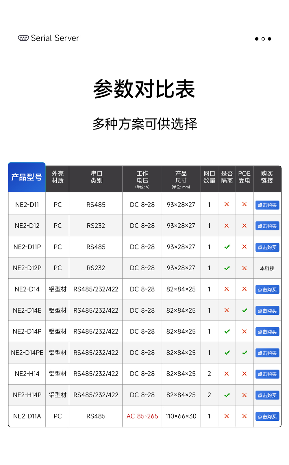 | NE2-D14 | RS485/232/422 | 以太網(wǎng) | TCP/UDP/MQTT/HTTP | - | DC 8~28 | 82*84*25 | 串口數(shù)據(jù)?以太網(wǎng)數(shù)據(jù)透明傳輸 | ||