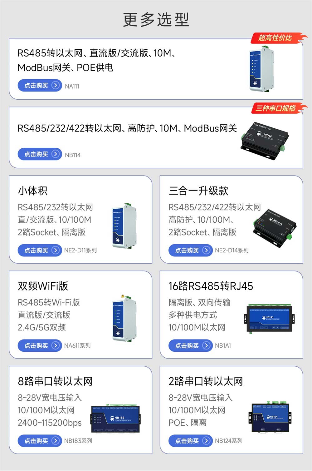 | NB114 | RS485/232/422 | 以太網(wǎng) | TCP/UDP、MQTT、HTTP、IPV4、DHCP | - | DC 8~28 | 102*84*25 | 串口數(shù)據(jù)?以太網(wǎng)數(shù)據(jù)傳輸 |